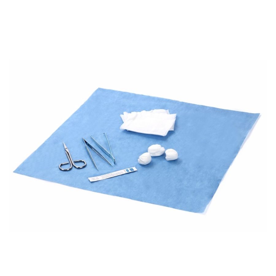 Spunlace-pallot, 35g/m² kehräysnauha, 3 kpl Kertakäyttöiset sidepihdit, metallia, terävä kärki, 12cm, 1 kpl Kudospihdit, metallia, 12cm, 1 kpl Spunlace-tyynyt, 14,5 x 19,35 cm, koko taitettuna 7,25 x 9,75 cm, 4-kerroksinen, 3 kpl Ompeleenpoistosakset, metallia, 14cm, 1 kpl Tarjotin, 17 x 11 cm, 1 kpl Kääri, 40 x 40 cm, 35 g/m² SMS kuitukangas, 1 kpl Steriloinnin merkkikortti, 1 kpl |
